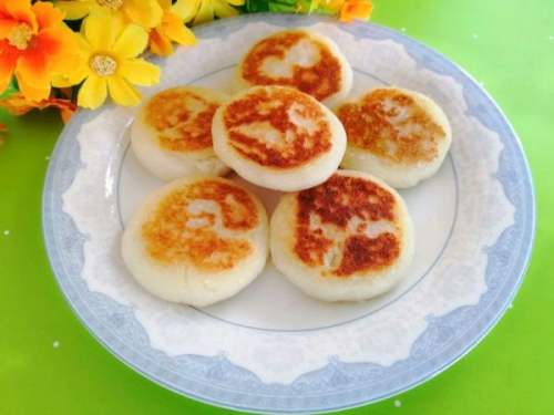 5不粘煎锅内刷油,把压成饼的山药泥放入