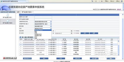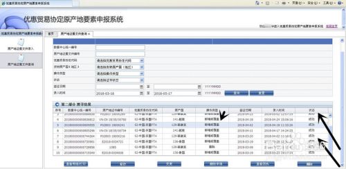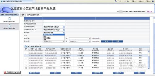 5申报完毕后,请点击左边原产地证据文件查询此栏中集成了录入后原产地证据文件的删除查询,新增查询,变更查询可以按查询类型要求进行操作.文件申报的状态等等都可以按此指定的关键字进行查询.同时也可以按不同的协定代码进行查询所录入的文件结果基本日常操作都是按默认的选项,点击设置一段时间段进行一个查询.查询的一个最主要的目的就是要看状态是否新增成功.成功状态下的原产地证据文件未补报关单所对碰的情况下.允许进行变更和修改.