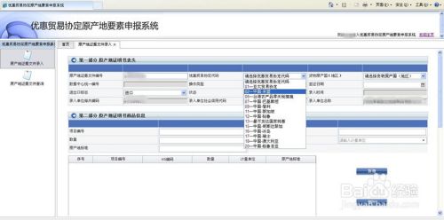 第二部份填写原产地证明书商品信息需要把产地证中的商品信息填入.主要是填写HS编码,数量,计量单位,原产地标准(Origin Criterion).部份协定中的产地证中汇总为一种货物,并只会标毛重.这时需要把申报中的每一种货物分开申报.分开填写数量.原产地标准.项目编号为自然排序编号.例:1,2,3每录入一种货物后,点击新增按钮后才允许增加下一条货物信息.