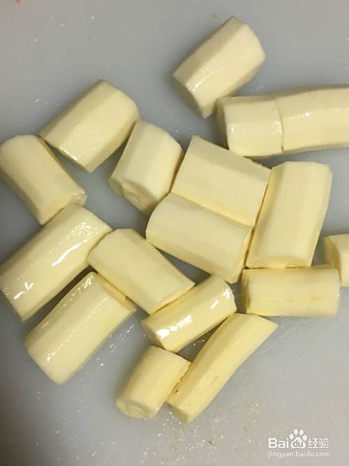 削干净皮的淮山再次放到水龙头下冲洗干净,切成小段,放进砂锅,加入适量清水浸泡,防止淮山变色。