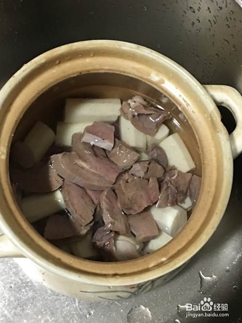 煮好的猪心水会比较浑浊,要用清水清洗三遍以上。洗干净的猪心切成小块放入砂锅中。
