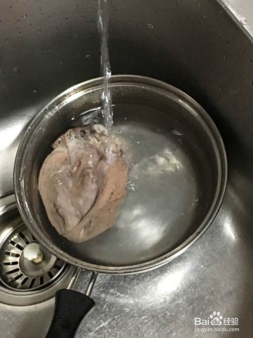 把猪心放到小锅中,加入适量清水,移到煤气炉大火烧开5分钟后关火。(这一步叫飞水,即去血水)