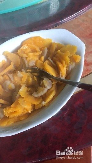 先把地瓜蒸熟,然后放入碗里用汤匙给压好