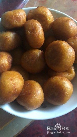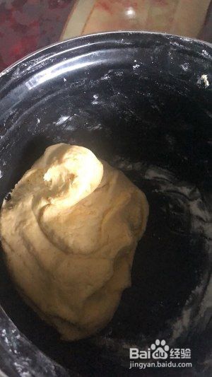 放入适当的糯米粉和搅好的地瓜一起揉面,然后放入适当的白砂糖继续揉,搜到图中不粘手为止