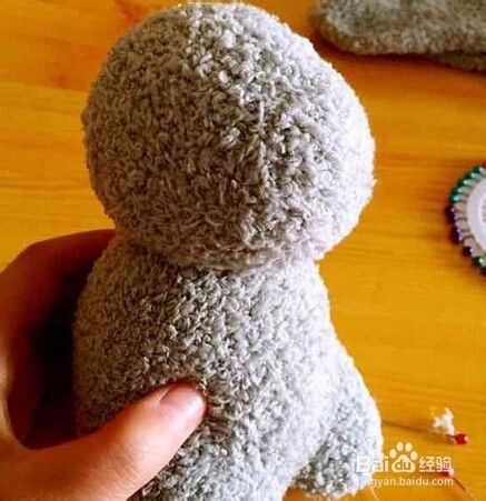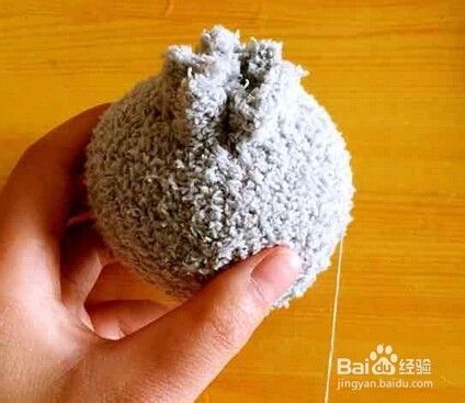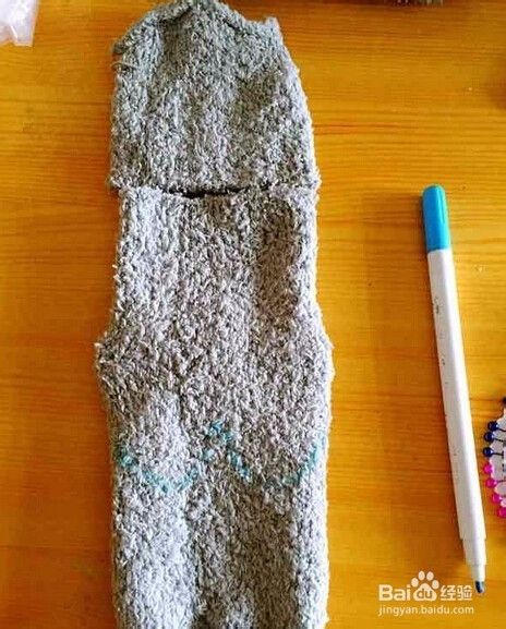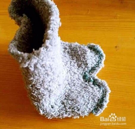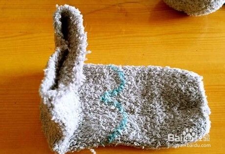 取其中一只拖地袜,翻到背面,从大改三分之一靠上的位置剪开,作为兔子的头部
