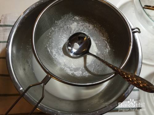 煮红枣的时候这边就可以开始调马蹄莲粉了,为了更细滑些我都是用筛子过到无颗粒的,500ml的水加粉后反复过滤然后放一边备用