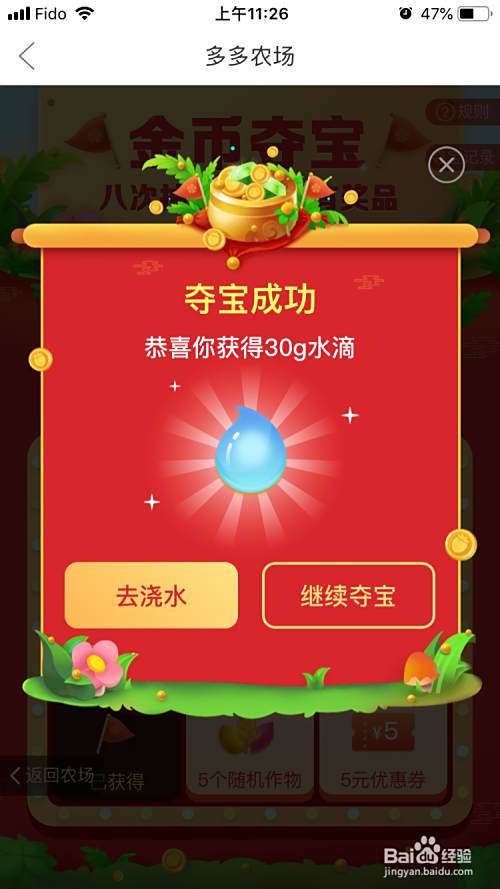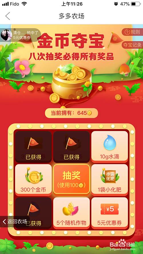 游戏中有一个金币夺宝的功能,9宫格的转盘,8中商品中有虚拟水滴,金币,肥料,以及特殊作物的果实。游戏设定是八次抽奖获得所有8种商品,八次抽奖一共需要消耗金币3440. 建议最多抽7次,需要金币1440,如果不到7次就抽到了特殊作物的果实,就可以停止了。