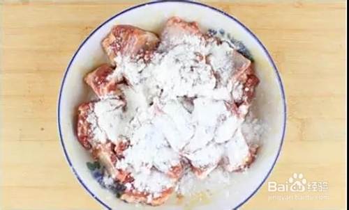 然后将适量的面粉和淀粉倒进去搅拌均匀后腌制两个小时最好