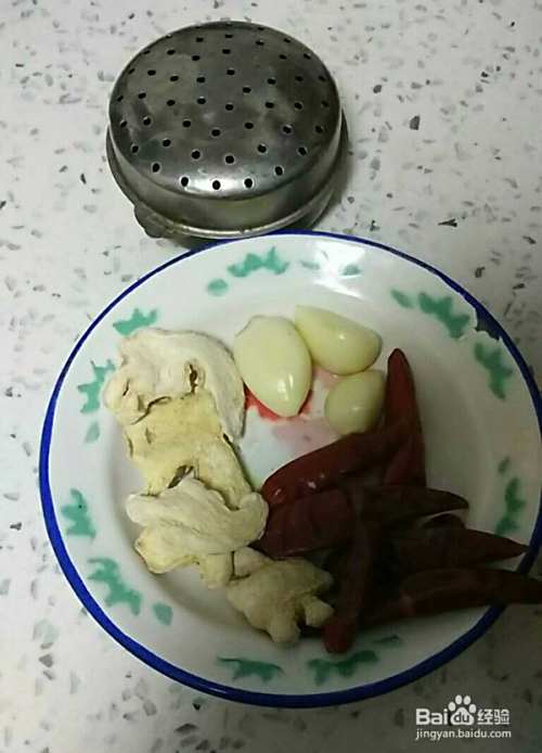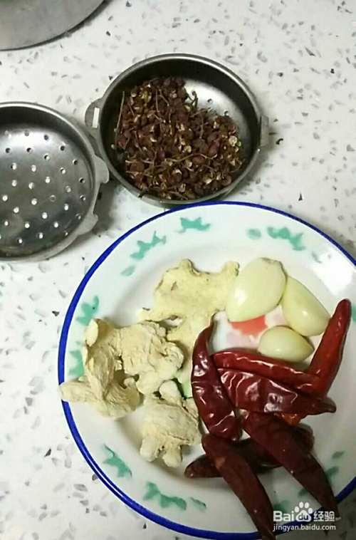 准备干姜四块,蒜三瓣,干辣椒7个,小盒子里放花椒,喜欢辣的可以多放一些