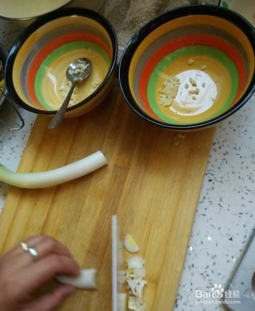 碗里准备蒜末,香菜末,葱末,根据个人喜好放。