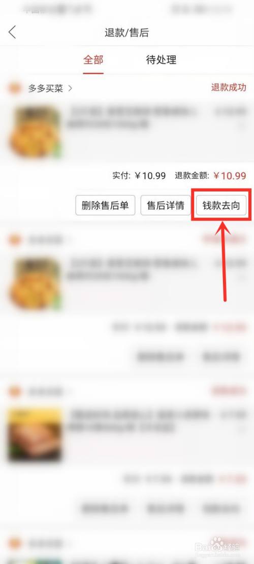 找到多多买菜订单,点击【钱款去向】,即可查询退款去向。