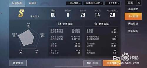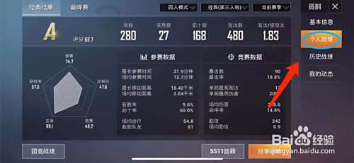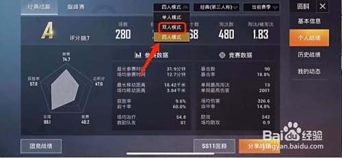 本经验分享和平精英如何查看经典模式中双排的个人战绩,包括场数、获胜数、前十数、淘汰数、参赛数据,以及竞赛数据。