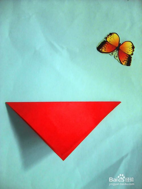 准备一张红色正方形纸。上下对角折叠,压好折痕后打开。