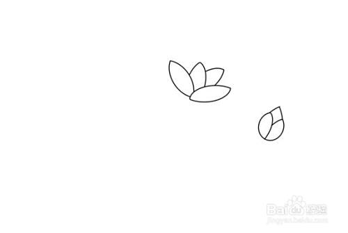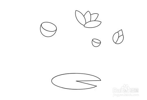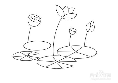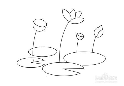 画三片荷叶。然后在每朵花和莲花根的底部画一条曲线。