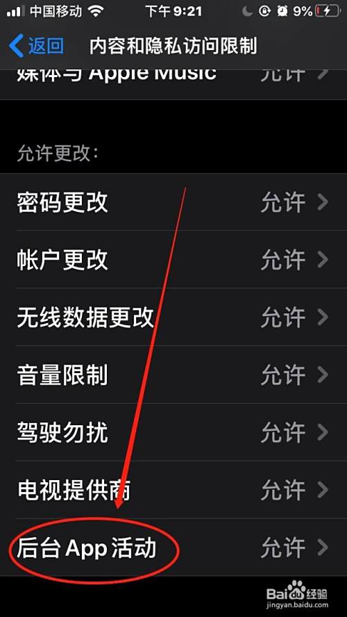 在“内容和隐私访问限制”页面,点击“后台app”,如下图所示。
