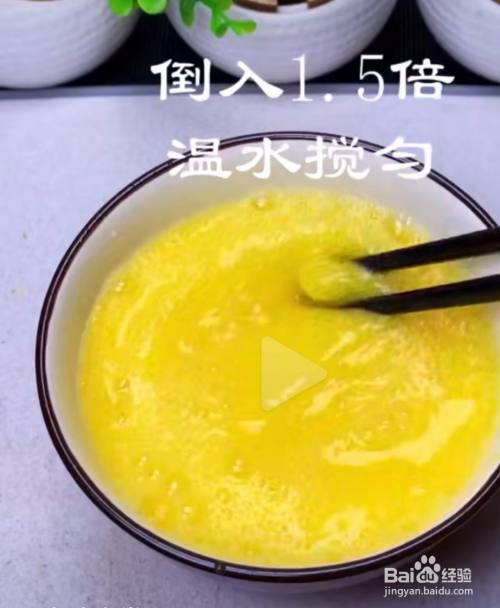拿两个鸡蛋打在碗里加少许盐,用打蛋器打散,再加入适当的温水搅匀。