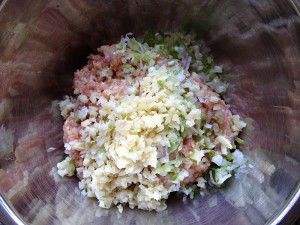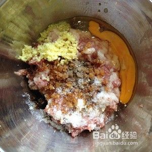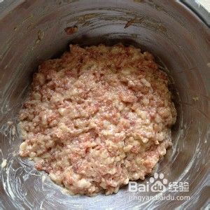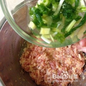 分次加入葱姜水继续用手朝一个方向搅拌,加水量大约是肉馅量的三分之一。