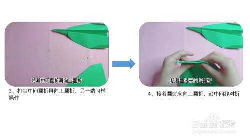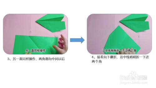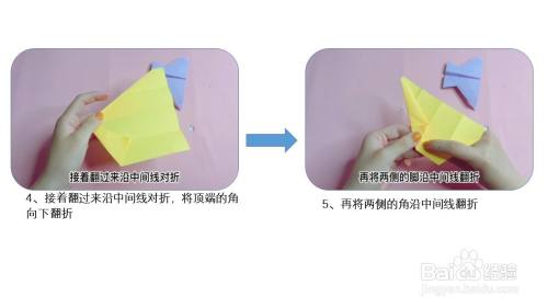 然后根据折痕,两边向中轴线对折,展开,将下面纸张沿折痕对折,再将纸张向中轴线对折折出翅膀。