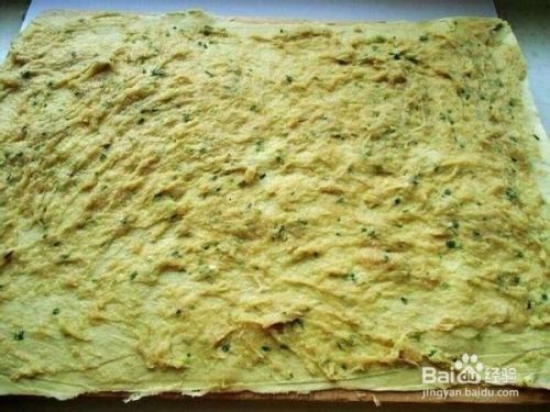 把豆皮铺在菜板上,均匀地抹上肉泥