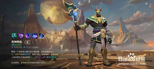 四技能死神降临:释放一个具有强大魔力的沙漠风暴,为自身增加300生命值,25护甲和魔法抗性,持续15秒。与此同时,对附近敌人造成相当于其生命值3