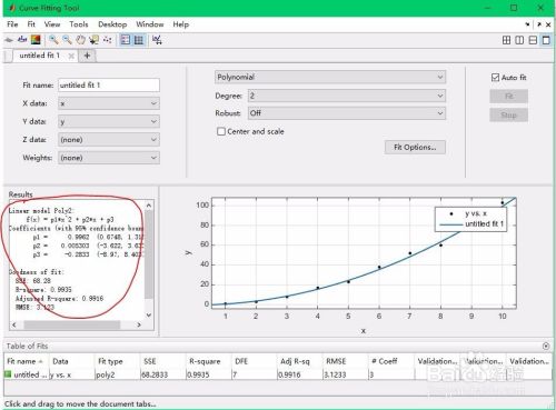 通过计算获得的p,是一个数组,对应了多项式的各项系数,以图中为例,拟合出的多项式为:y=0.9962x2+0.0053x-0.2833。