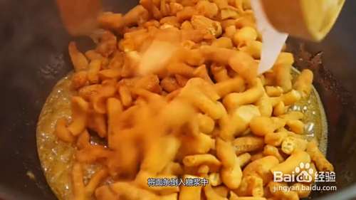 小火将糖煮融化,沸腾后熬10分钟,将面条倒入糖浆中,快速翻炒。