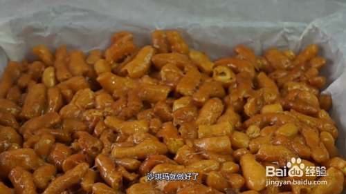 将小面条油炸后,熬制出糖浆,将小面条和糖浆混合,倒入方形容器中,放凉凝固后,沙琪玛就做好了。