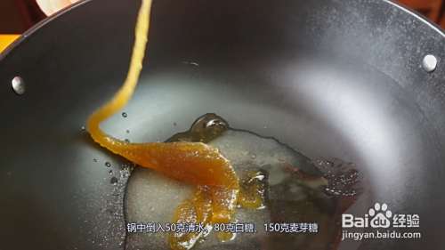 炸至金黄后捞出控油,放凉后切成小段,锅中倒入50克清水、80克白糖、150克麦芽糖。