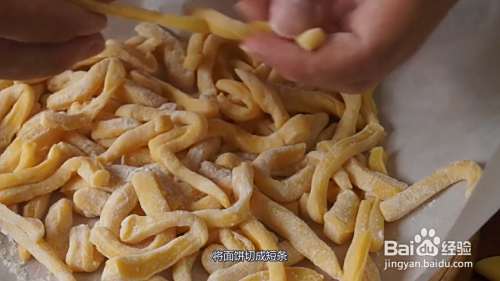 将面饼切成短条,撒上干粉,均匀的裹上,避免粘在一起。