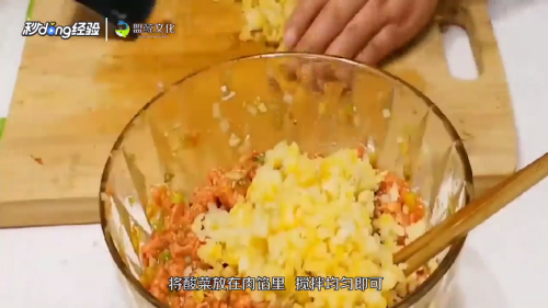 10将酸菜放在肉馅里,搅拌均匀即可。
