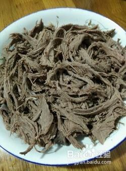 2.稍凉后,把外膜弄破,里边会看到一丝一丝的肉肉,把全部猪心撕成下图那样的