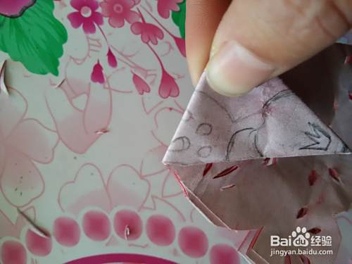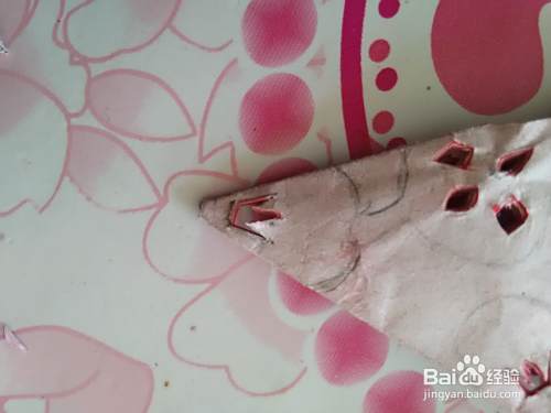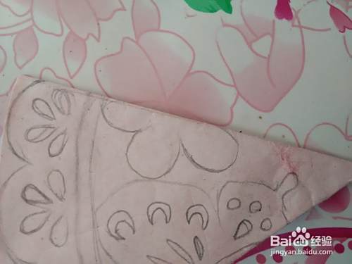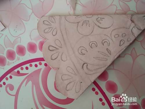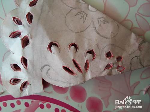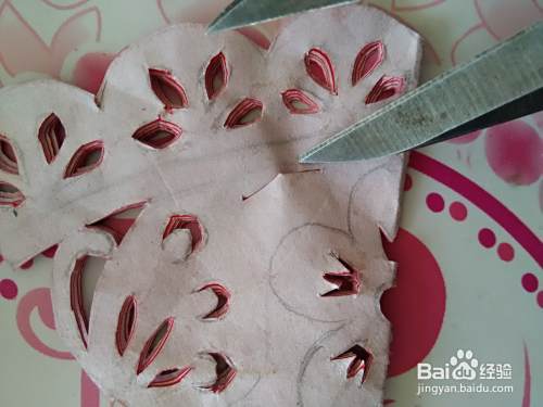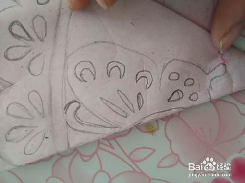 图案边缘部分可以先把图案去掉的部分对折(如图),用剪刀剪开(如图),把剪刀伸进去按边缘剪好(如图)。
