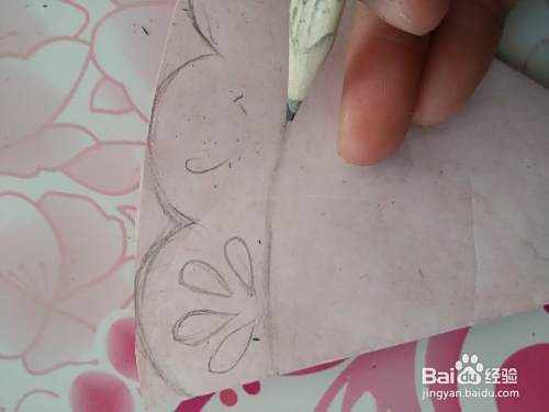 再用铅笔在另一边画出花朵图案(如图),再进一步画出细节(如图)。