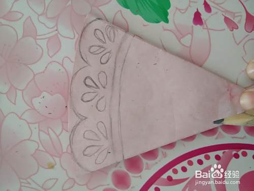 按图用铅笔画出弧线(如图),用剪刀剪掉多余的部分(如图)。