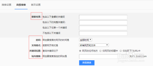 高级搜索设置:包括关键词、时间、输入的关键词出现在何位置以及精准的网页地址,此项搜索针对性强,可根据您的需要酌情设置;