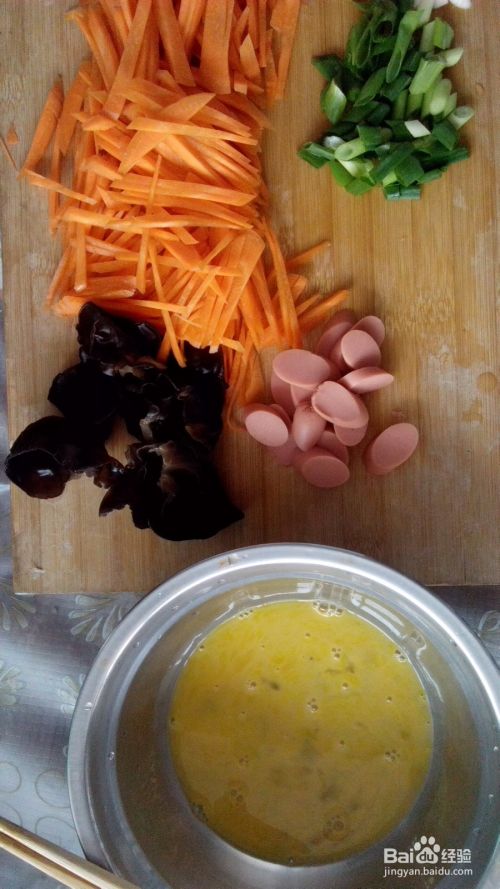 原料处理:胡萝卜切丝,木耳泡发,香肠和小葱切块,鸡蛋打散。