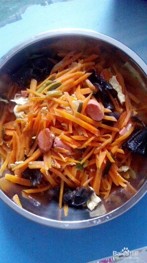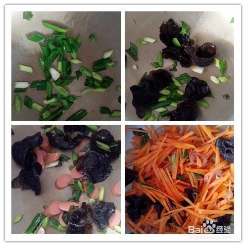 锅中倒油,待油热加葱花爆锅,依次放入木耳、香肠,分别煸炒几下。最后放入胡萝卜,加入适量水及少许醋,盖上锅盖。