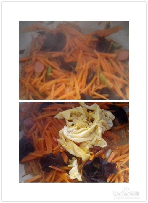 待胡萝卜稍软,放入炒好的鸡蛋,翻炒几下。