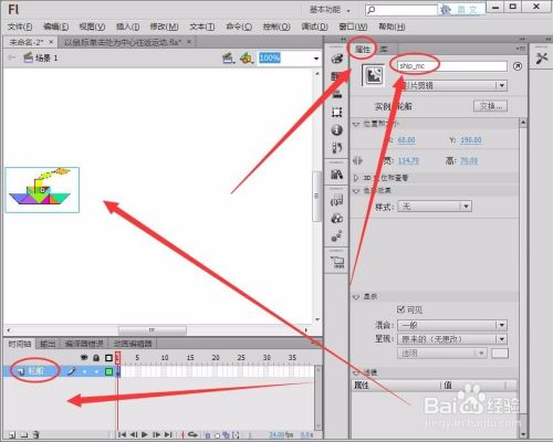 在舞台中制作一个影片剪辑元件“轮船”,在属性面板中,将实例名称取名为“ship_mc”。