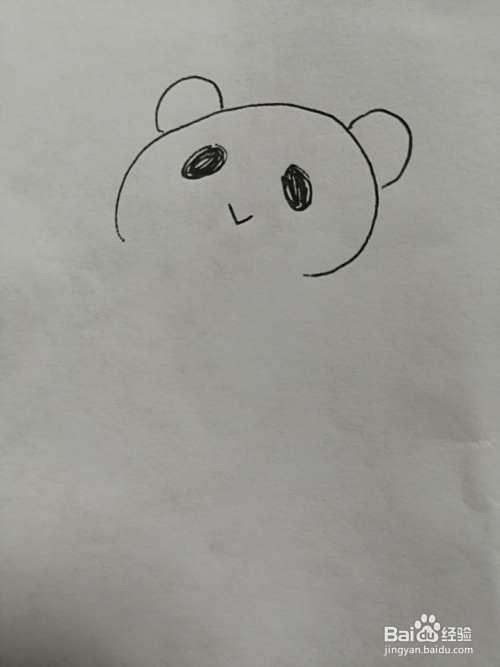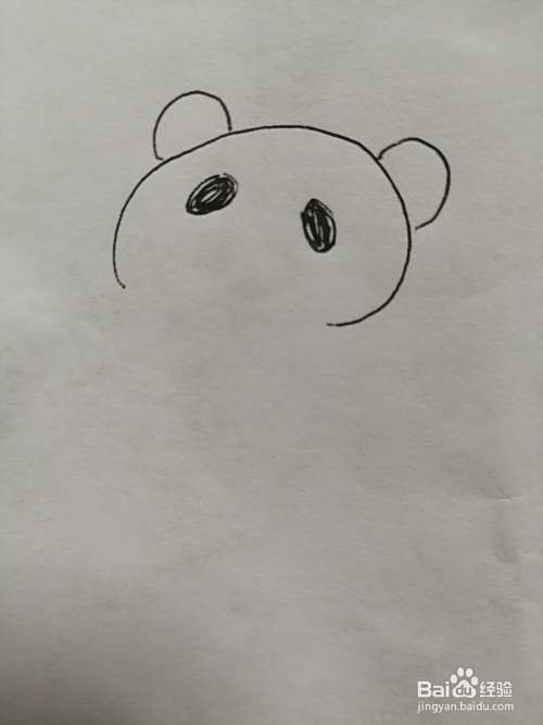 第二步,接着在可爱的小熊猫的头部里面画出两只黑色的大眼睛和可爱的小鼻子。