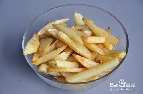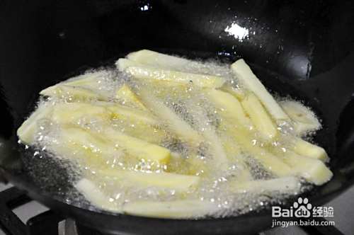 锅中热油,倒入控干水分的土豆条,炸至金黄色。