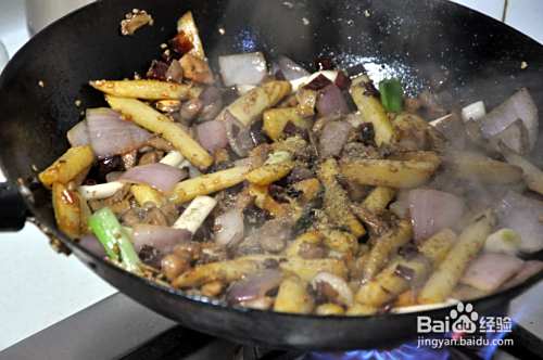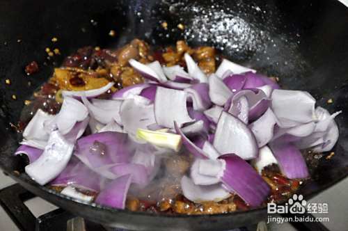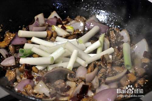 水分收得差不多的时候,倒入洋葱,继续翻炒。