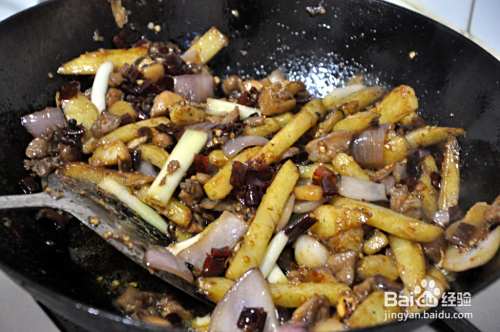 倒入干辣椒段,辣椒量根据个人喜欢的程度,我这个辣椒看着不算多,但是真的很辣。