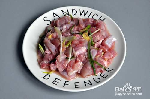 在兔肉里放入料酒、小葱、姜片和少量的盐,腌制10分钟。