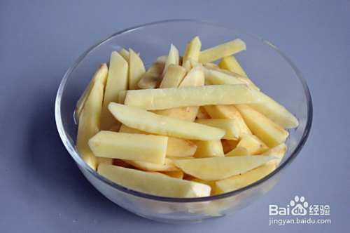 先把土豆洗好,去皮切条,之后放水中浸泡十分钟,倒掉水,撒适量的盐腌制10分钟,土豆尽量选个头大的。