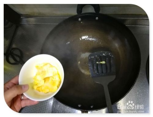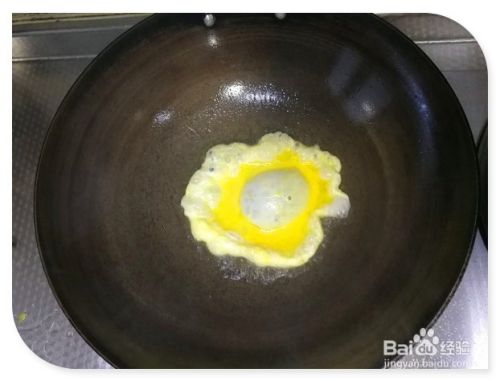 大火烧锅,放适量的食用油,然后把鸡蛋倒进去,慢慢翻动一下,让其蛋液凝固。