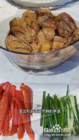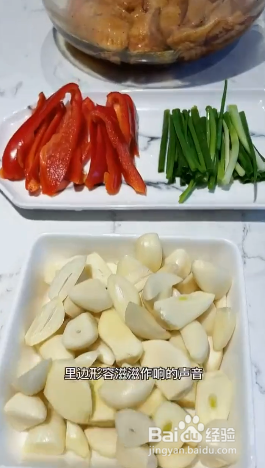准备大量的蒜、红椒、蒜苗,锅里不要放油,放上鸡翅煎至两面金黄;