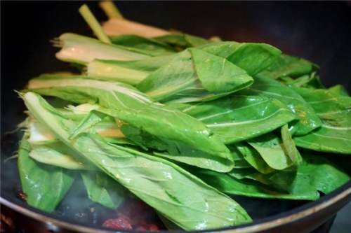 5等一分钟后放入切好的绿菜苔段,炒匀后再等一分钟,即可关火出锅。