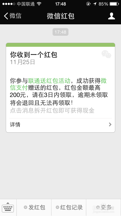 微信红包领取方法,最近联通手机营业厅和微信支付推送冲话费,送微信红包的活动。时间11.25-11.29.