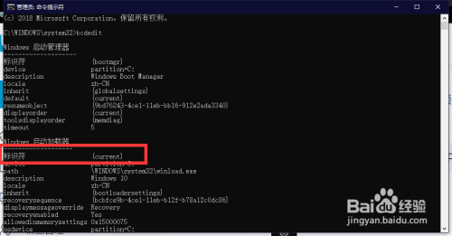 输入bcdedit,找到标识符,如果你在本地有PE系统,那么这里是一串代码,复制